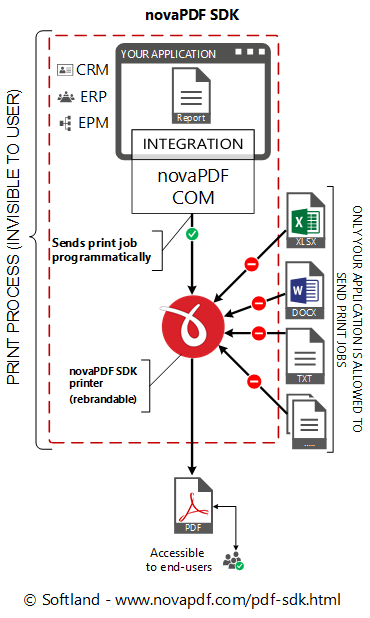 novaPDF SDK is a pre-processing PDF tool, thus the resulting PDF files can be accessed directly by your application's end users. They cannot print directly to the SDK printer, however resulting PDFs are accessible to them.