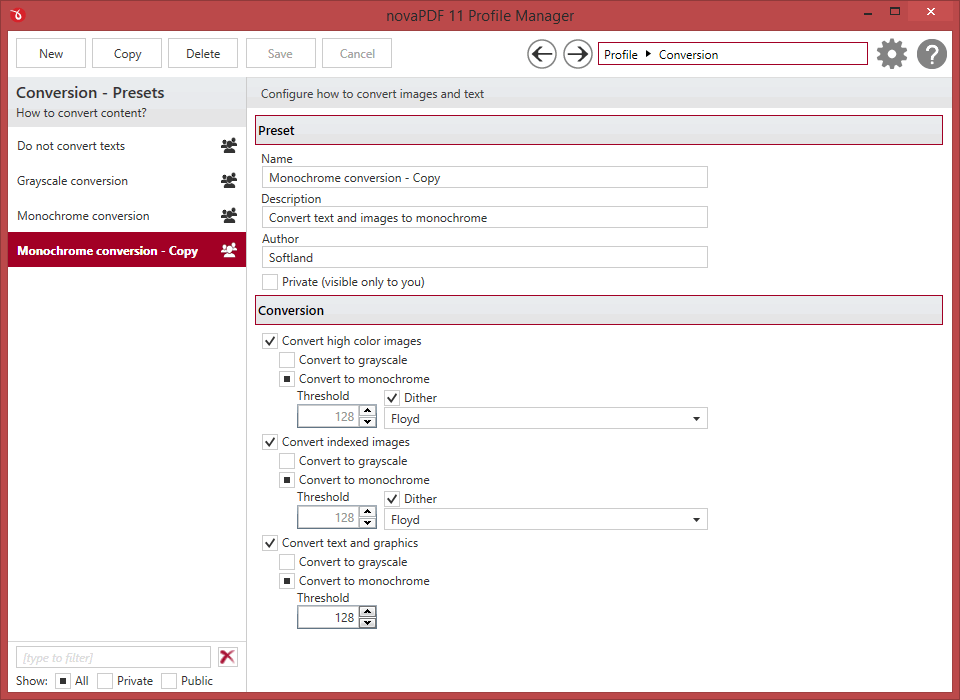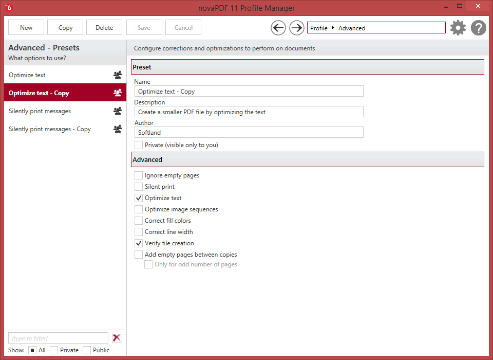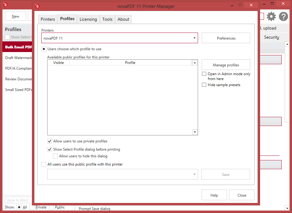 You can define private printing profiles for future use, each with its own profile settings (i.e. security, signatures, bookmarks). This way you can switch between different printing profiles without having to modify the settings again. These profiles are only available on the computer where they were defined.
