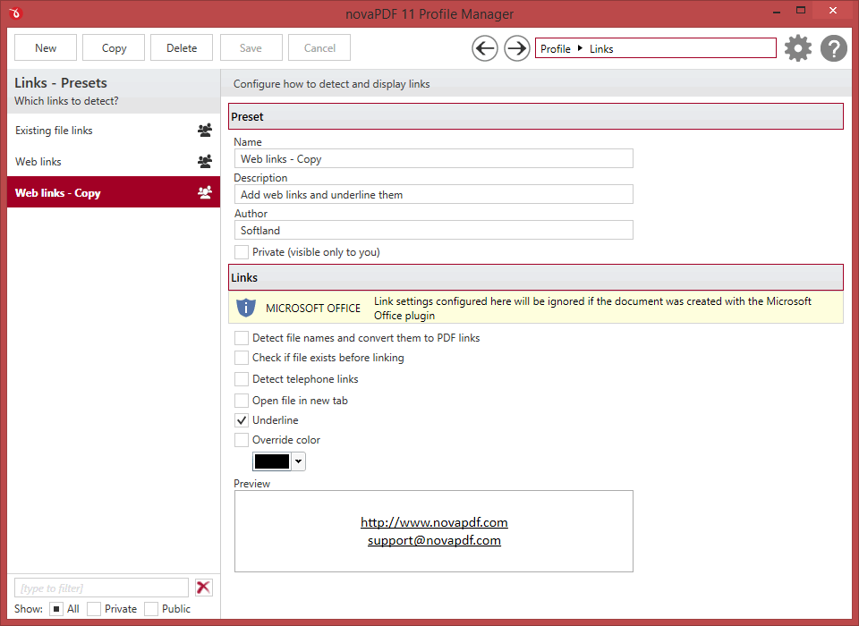 novaPDF can also verify if the file linked to exists during conversion to avoid broken links. Additional options allow opening the file in a new tab and customizing the underlining.