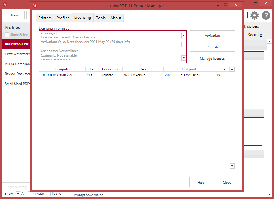 This allows you to manage the licenses for the installed printer driver. Managing licenses is useful when using the installed printer driver as a print server (via the shared network printer or remotely) to add, license, un-license computers/users, and release licenses.