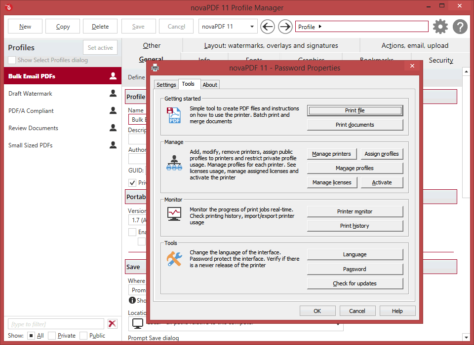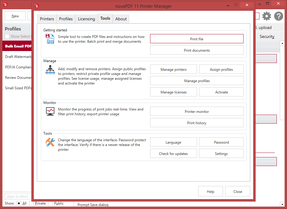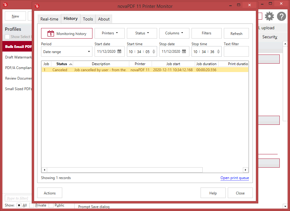 A Printer Monitor tool is distributed with the novaPDF installation as well. This tool allows you to monitor in realtime the status of all printing jobs, as well as record and archive print job info.